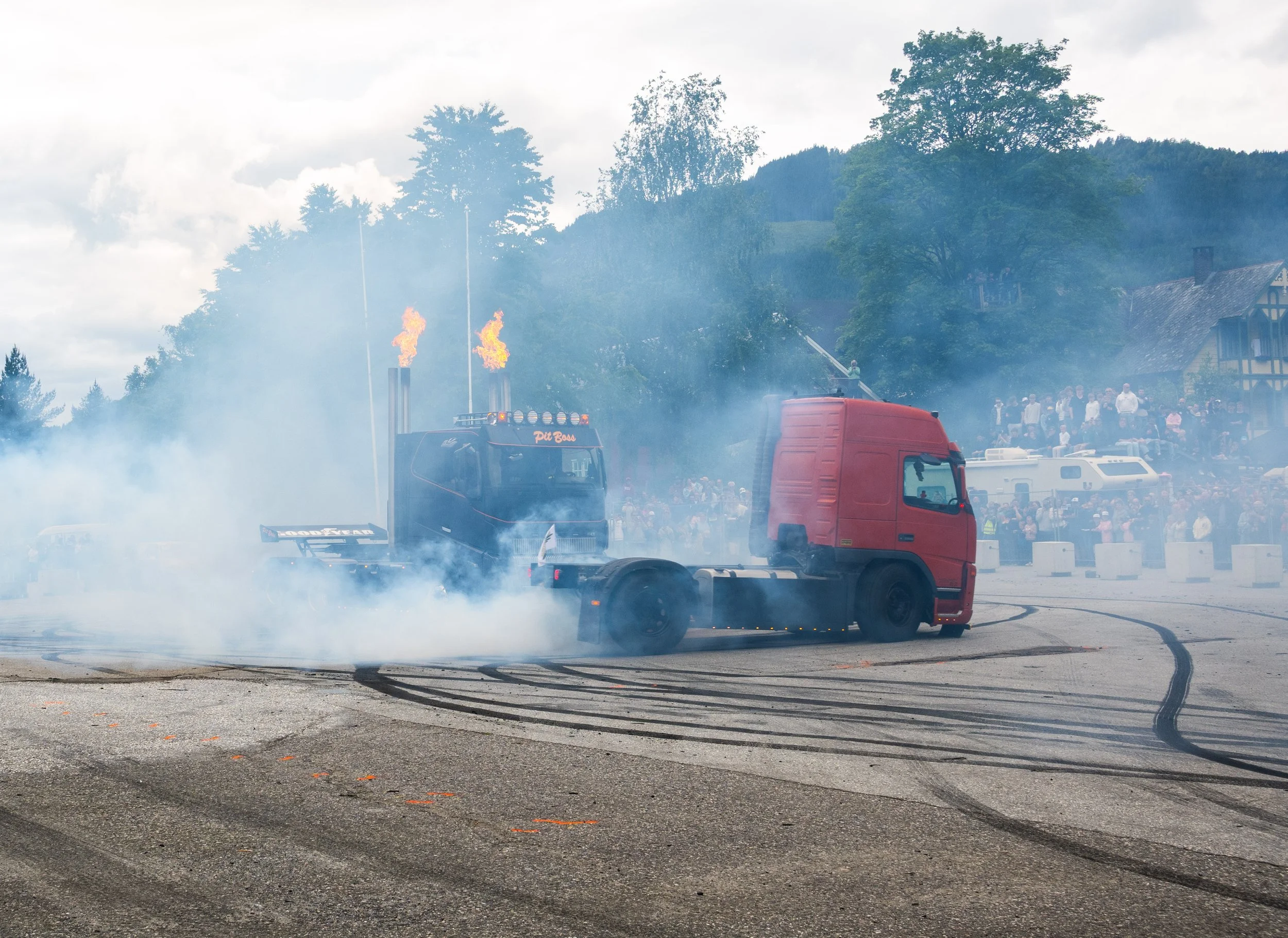Så det neste på programmet vart Motorfestivalen i Stryn. Her vart det blårøyk og drifting! Men fortsatt problem med sperra. I februar vart det kjøpt ein brukt bakaksling ned på Jæren, det kunne no være kjekt å ha i bakhånd. Den kom til si nytte før vi skulle vidare til Trøkk`n Truck i Førde. Den vart skifta, i tillegg til at vi fikk ein sponsor på heillakkering av bilen!! Sponsoren, Vestland Lakkservice, ville at bilen skulle være ferdig lakka før vi reiste til Førde. So då var det berre å hive seg rundt, 14 dagar før vi skulle reise nedover! Det gikk! Fikk på lakk og logo i siste liten!